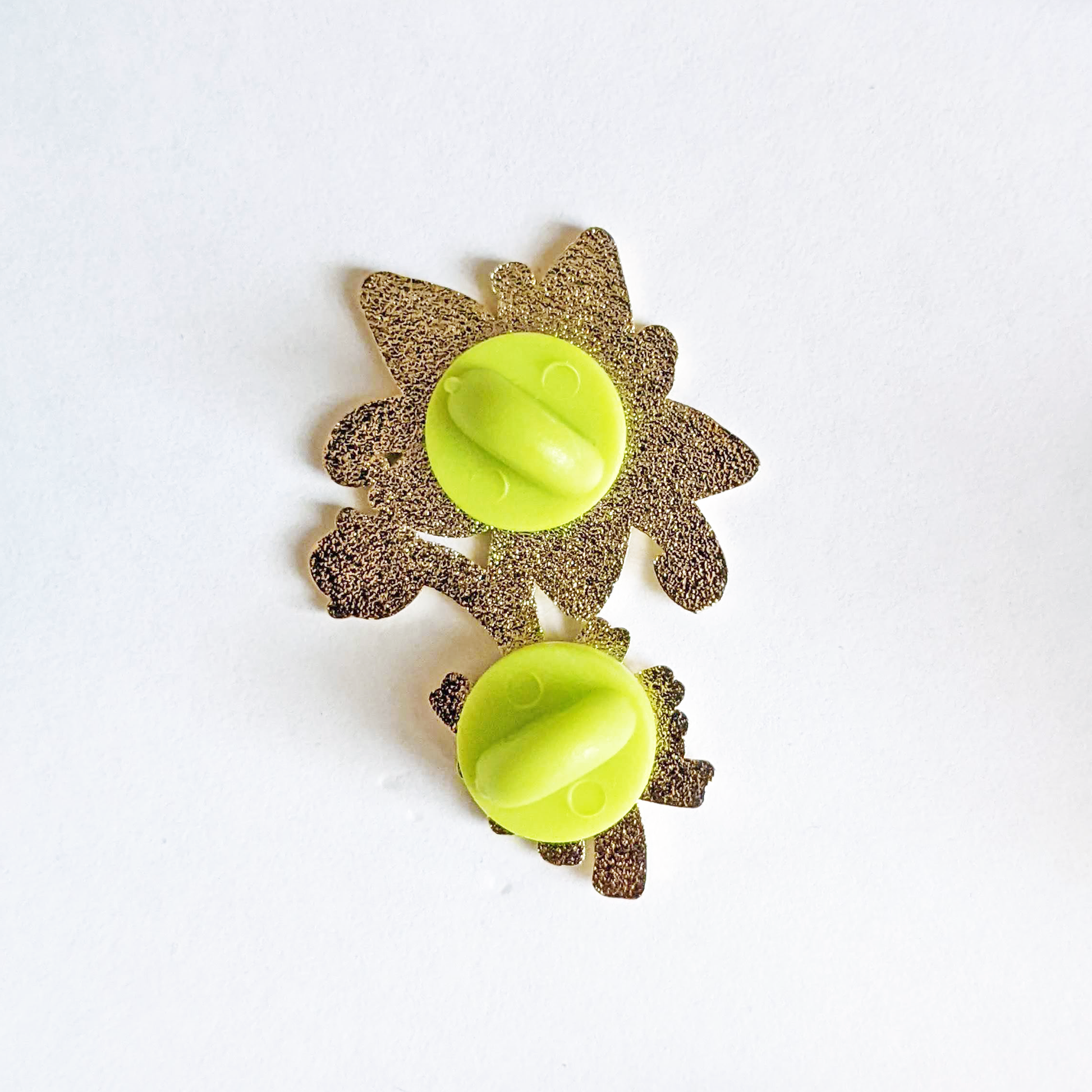 Hard enamel, gold metal, glitters, 2Â green rubber back clutches